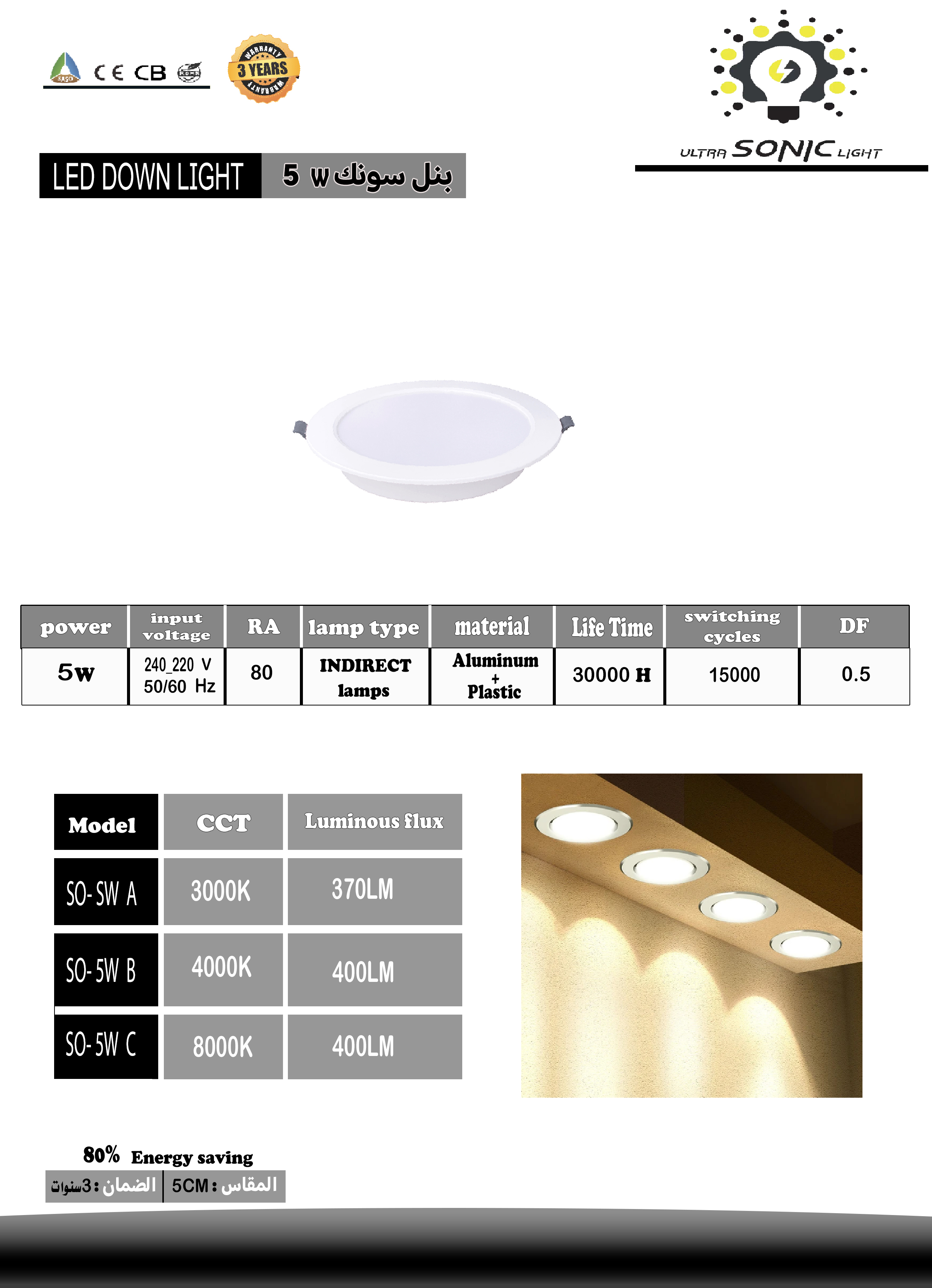 - بنل سونك 5 وات – Downlight LED دائري بجودة عالية وإضاءة قوية موفرة للطاقة 7 سم.
