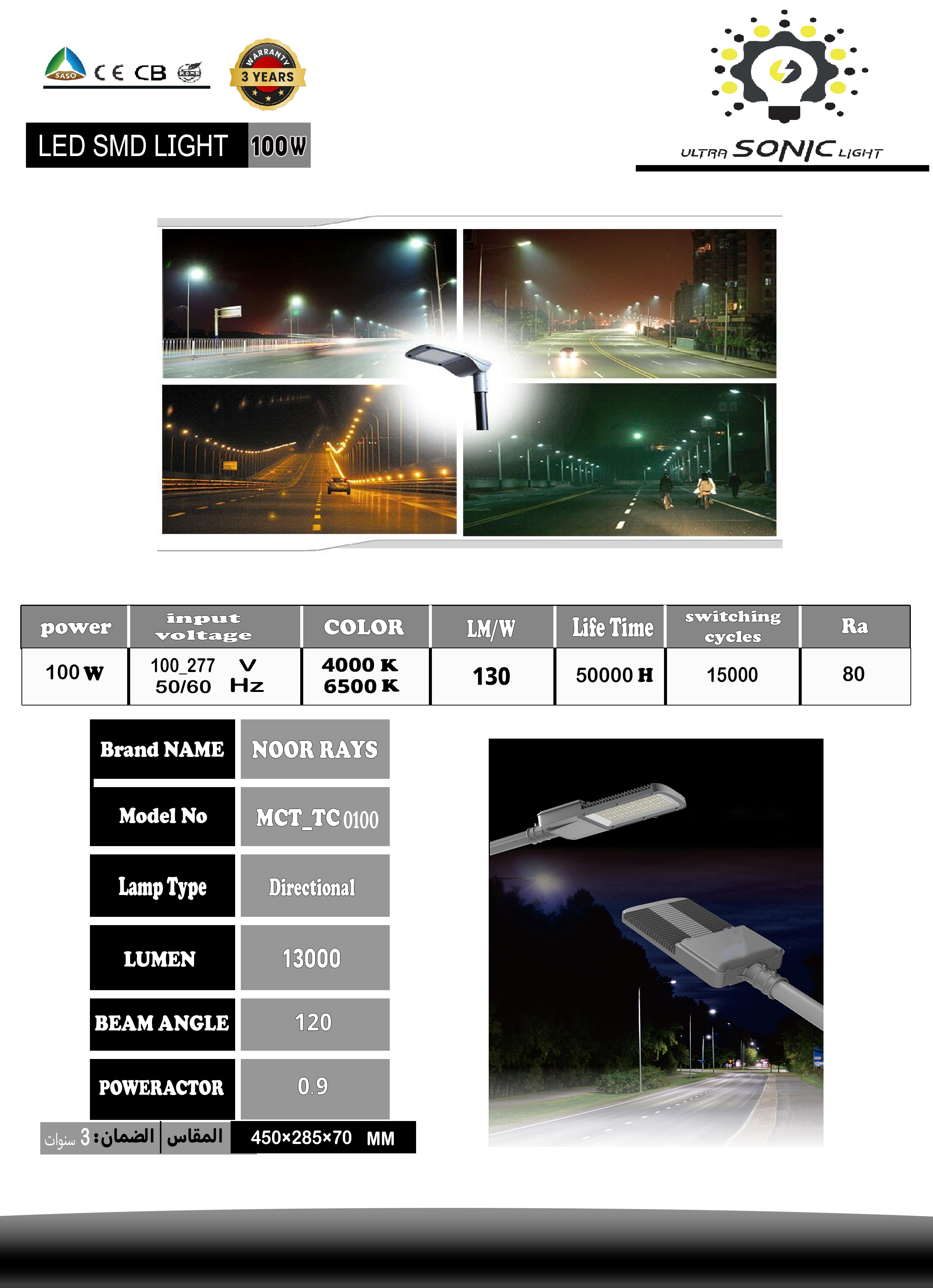 تقدم لكم ومضة للانارة كشاف شارع ليد 100وات حيث انه يتميز بانه سهل التركيب وله تصميم جذاب ورائع كما انه يجب ان يتوفر في الطرق والشوارع والمؤسسات وذلك لانه يتميز باضاءة قوية تمكنك من الرؤية بكل وضوح حيث انه مصنع بجودة عالية لا تتعرض الانارة الموجوده به للاحتراق وتتحمل لفترة طويلة تغطي مساحة كبيرة واسعة.