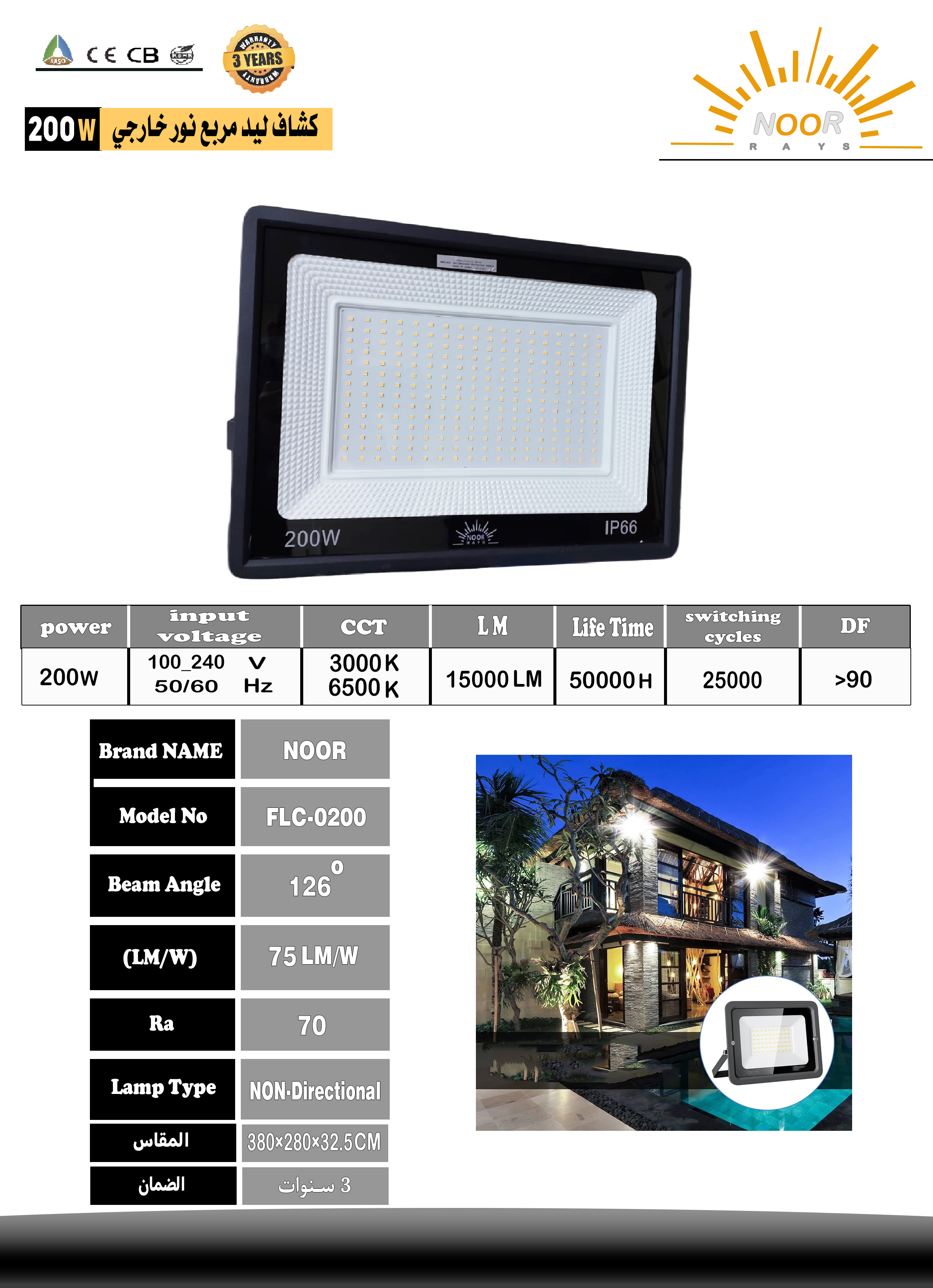 كشاف ليد خارجي عالي الكفاءة بقوة 200 واط، مثالي لإضاءة مساحات واسعة مثل الحدائق والممرات. يتميز بتصنيف IP66 مما يجعله مقاومًا للماء والغبار، مما يضمن أداءً طويل الأمد حتى في الظروف الجوية القاسية. يوفر هذا الكشاف إضاءة ساطعة و واسعة الزاوية، بادر واحصل عليه الآن .