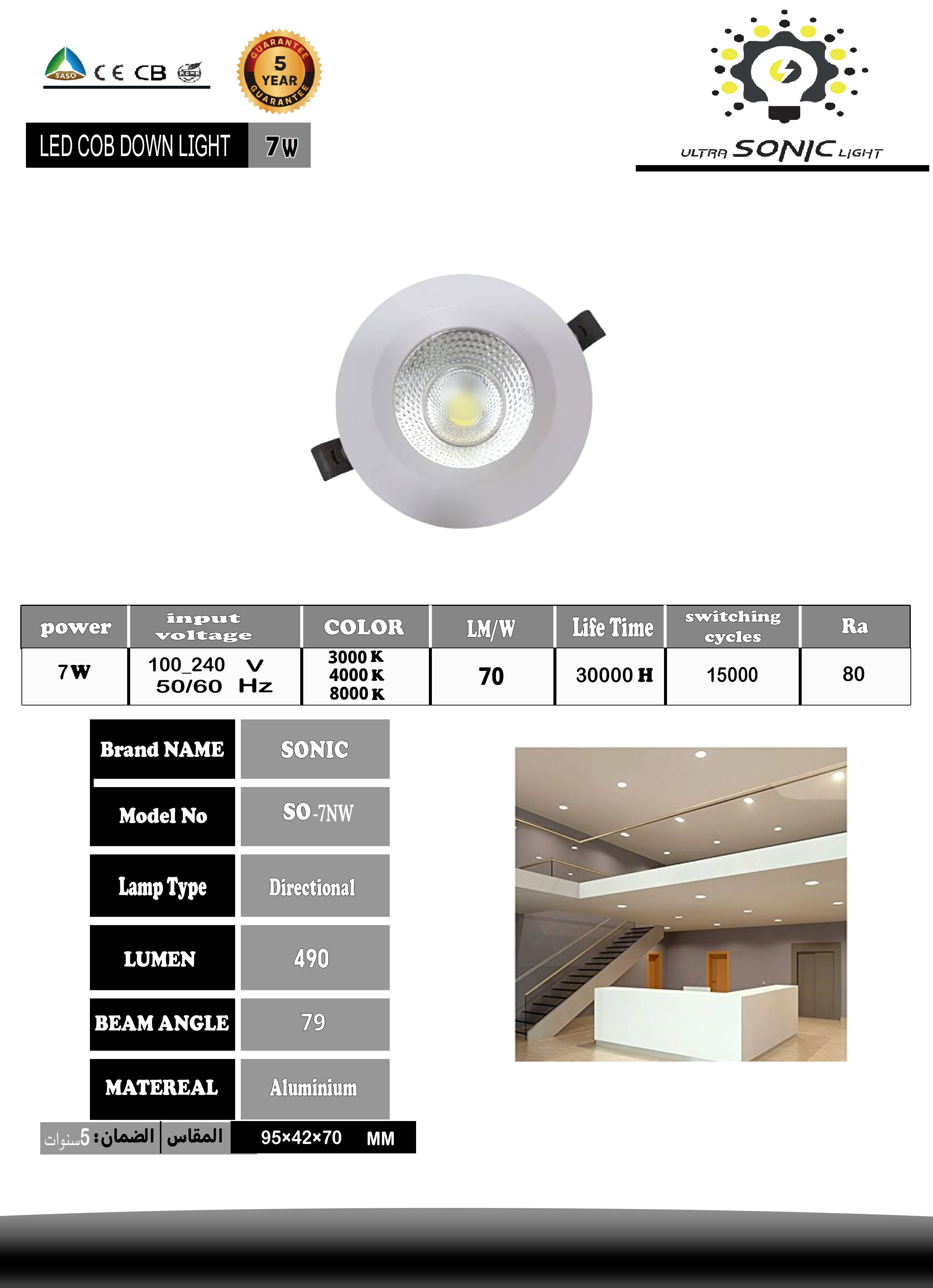 اختار إضاءة عملية وأنيقة مع كشاف سونك COB بقدرة 7 وات، واللي يعتبر من أفضل حلول الإضاءة الموفرة والموجهة للمساحات الداخلية. مناسب جداً للأسقف الجبسية، الممرات، المداخل، والمكاتب، ويتميز بإضاءة مركّزة ذات زاوية شعاع 79 درجة لتوزيع إضاءة مثالي.