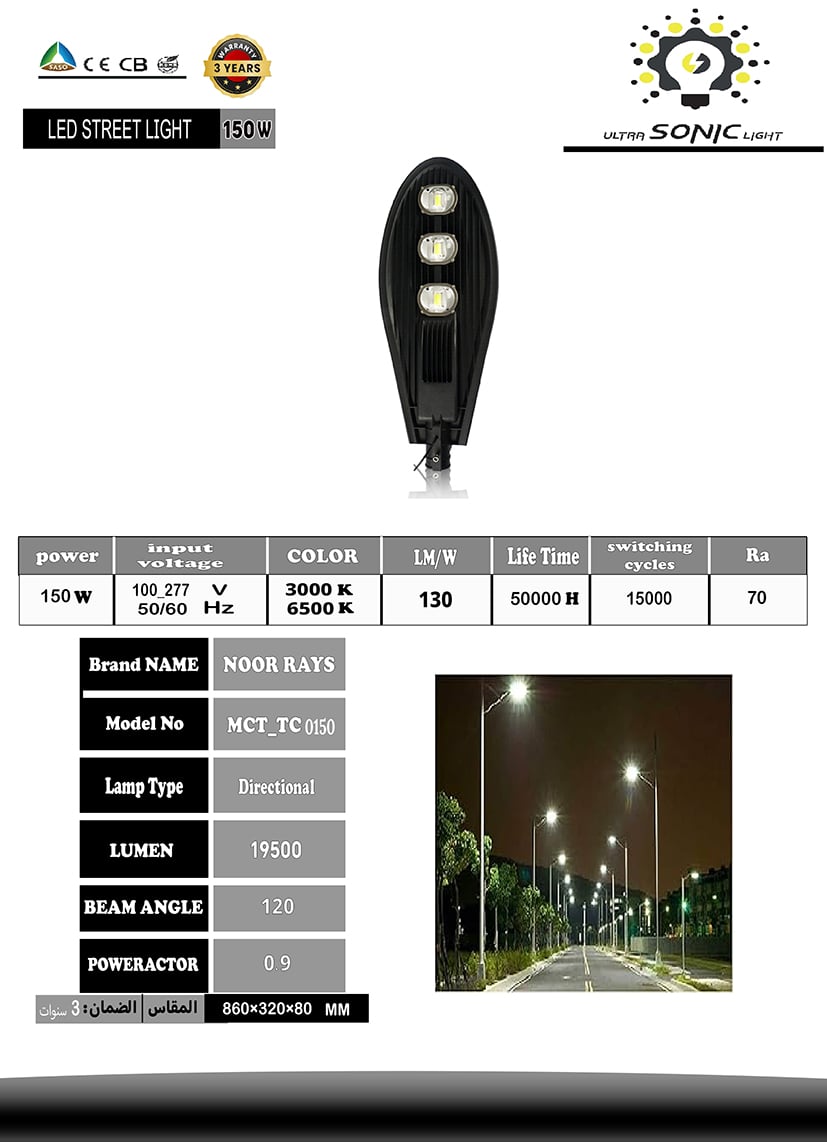 مع كشاف شارع LED عدسات وداعًا لمصابيح الشوارع التقليدية! اكتشف الجيل الجديد من إضاءة الشوارع فائقة السطوع. هذا المصباح يتفوق على المصابيح التقليدية في كل شيء: عمر أطول، إضاءة أكثر سطوعًا، استهلاك أقل للطاقة، ومتانة أعلى. استمتع بإضاءة موثوقة وواضحة لسنوات عديدة مع ضمان 3 سنوات.